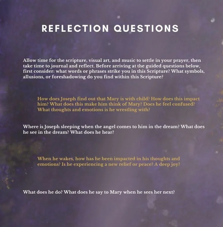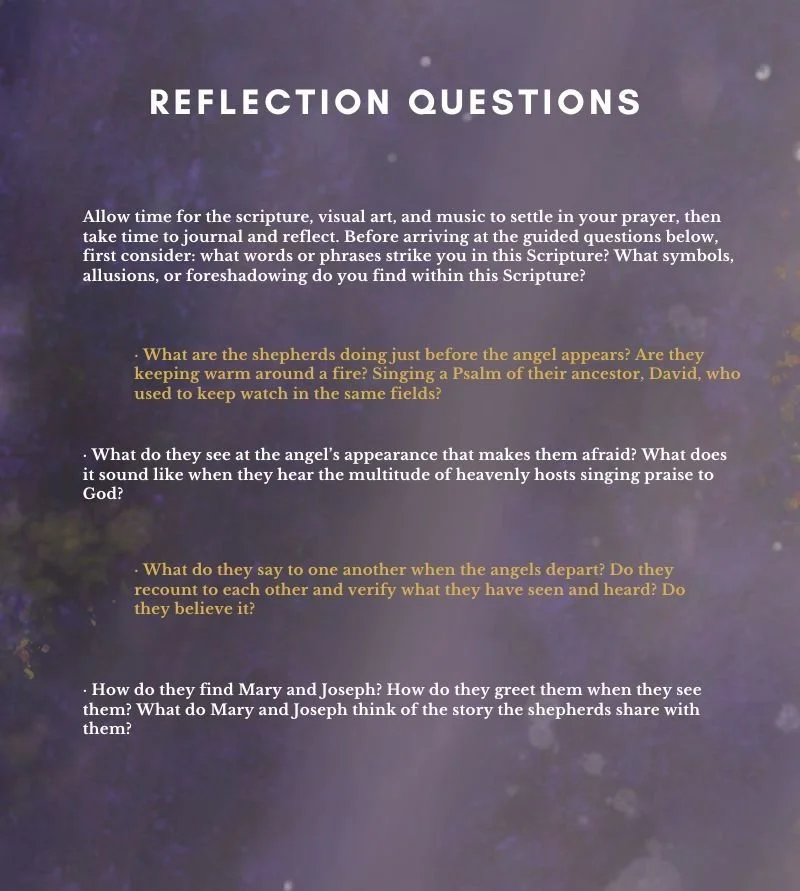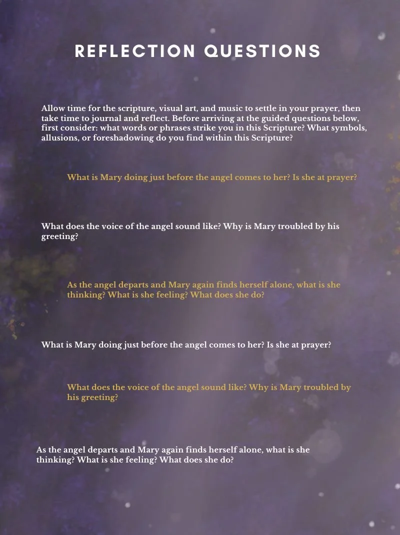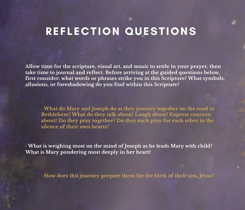 In the tradition of St. Ignatius of Loyola, Way of the Star uses music and visual art as a means of sparking imagination and meditation on the Nativity of Our Lord Jesus Christ. Each of these reflections can be treated as a Lectio Divina: taking time to read and reread scripture, and discuss or journal what the Lord places in your heart as you place yourself in the scene of each passage.
